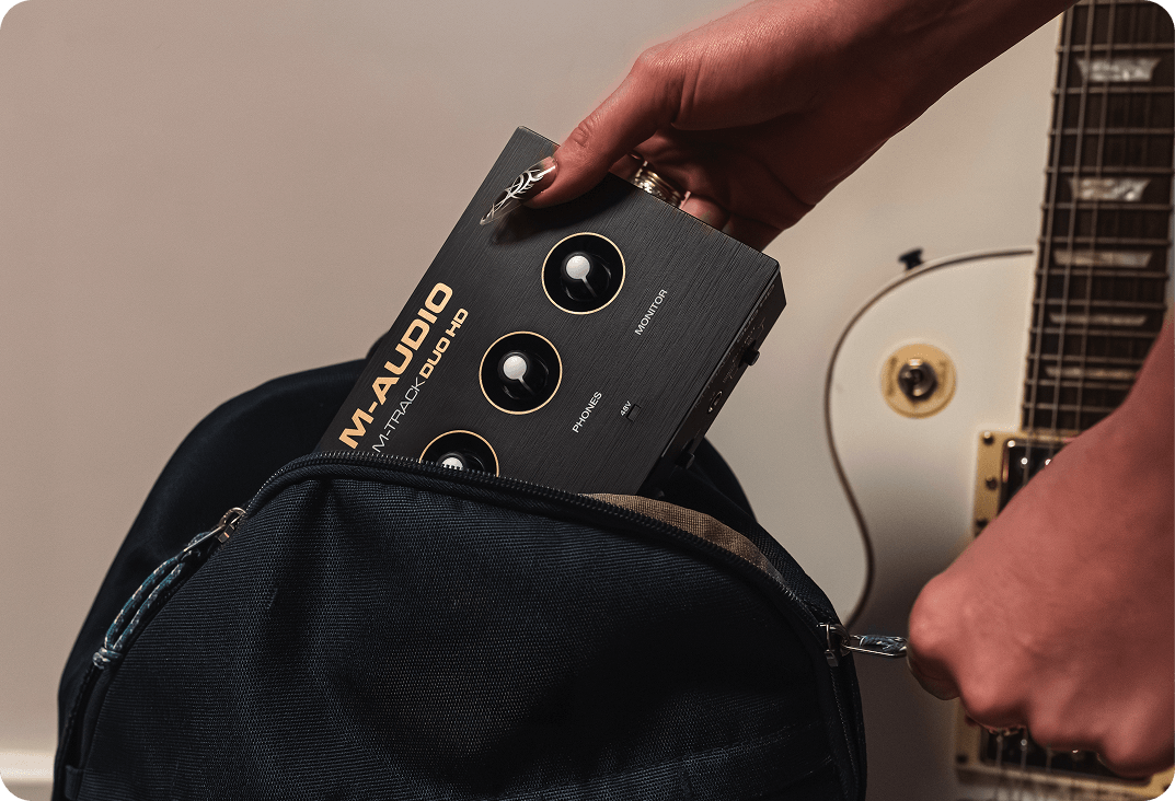M-Track Duo HD ses arabirimi, tam kararında eklentilerle sadeleştirilmiş bir kontrol setine sahiptir: iki combo XLR/TRS girişi, iki adet ¼ TRS çıkışı, bir kulaklık jakı, son derece şeffaf Crystal™ preamplar, profesyonel kalite dönüştürücüler, seçimlik +48V fantom güç, USB-C bağlantısı ve ses yolculuğunuzu zenginleştirmeye yardımcı olacak yazılımlara erişim.