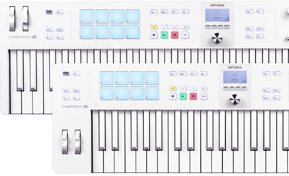 KeyLab Essential, kurulumlarına modern ve taze bir görünüm katmak isteyen içerik üreticiler ve müzisyenler için renkli RGB padlerle tamamlanmış çarpıcı beyaz bir kasa ve tuşlar sunar.