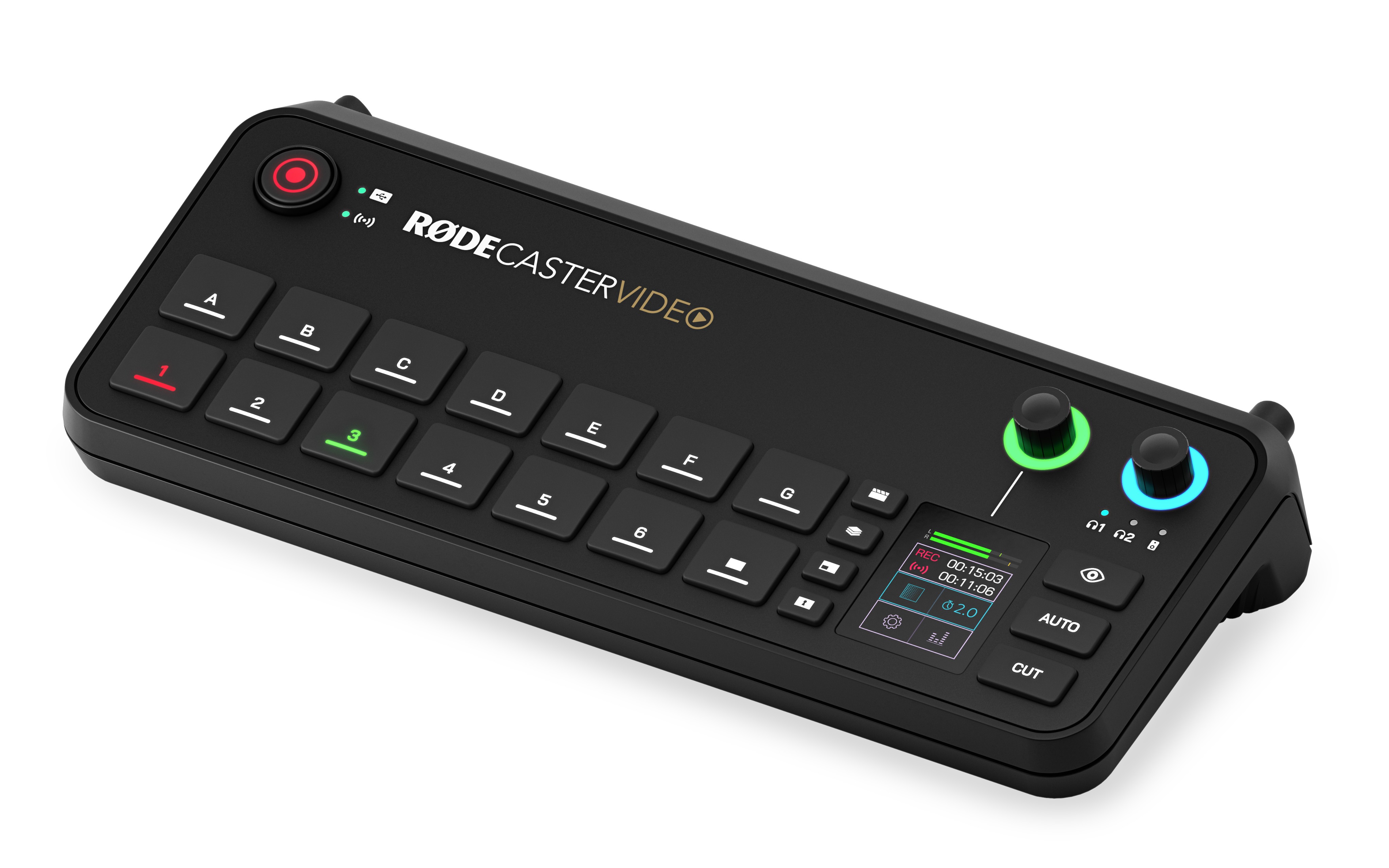 Dört özel işlev düğmesi, medya dosyalarına, grafik overlay'lere, otomatik yeşil perde anahtarlamasına ve çok kaynaklı düzenlere (örneğin, resim içinde resim veya bölünmüş ekran) hızlı erişim sağlar. RØDECaster Video'nun sahne tabanlı mimarisiyle birleştirildiğinde, karmaşık sahneleri anında oluşturabilir, kaydedebilir ve aralarında hızla geçiş yapabilirsiniz.