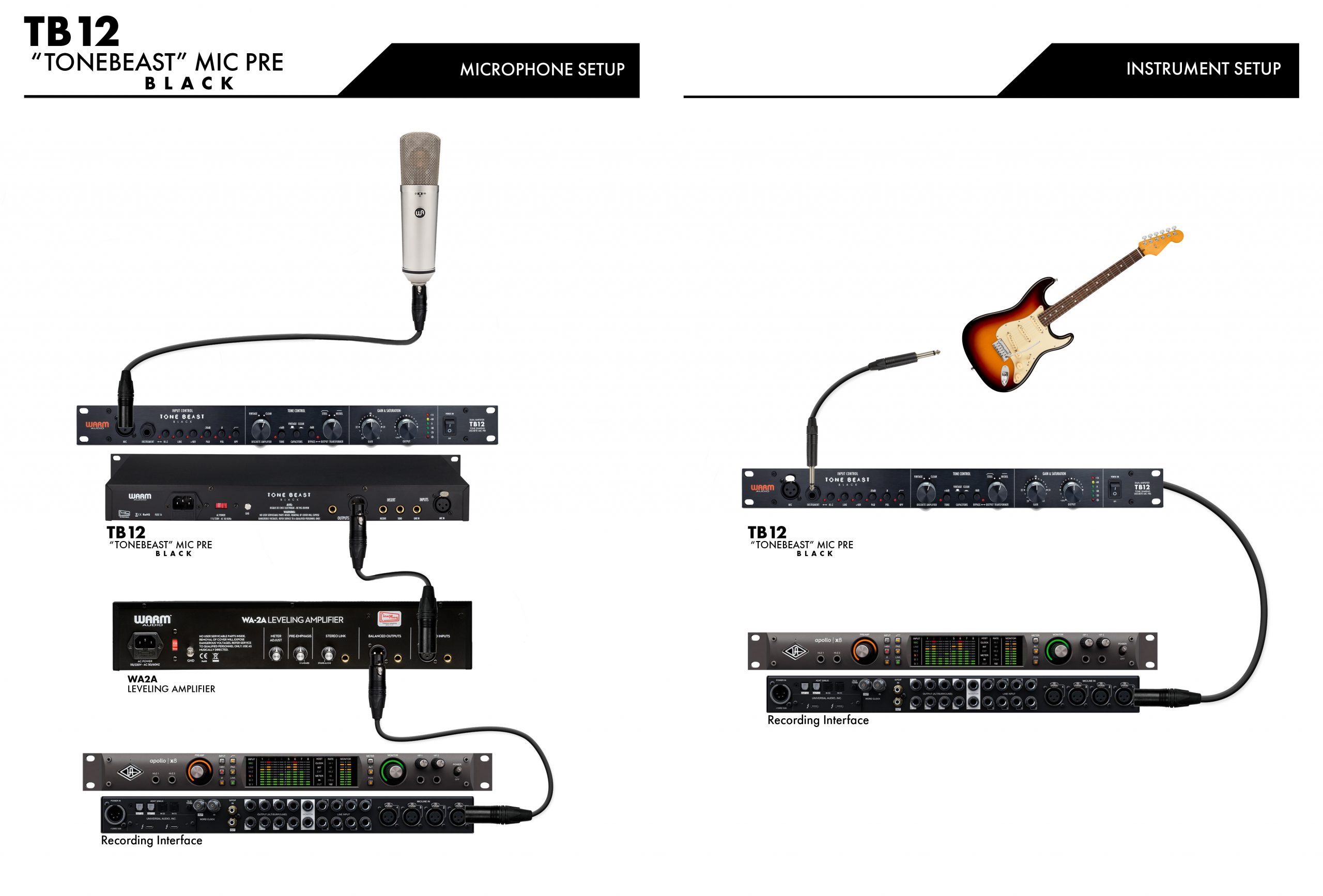 Tone Beast TB12, CineMag USA Transformatörlerini kullanan tamamen ayrık, yüksek voltajla çalışan bir mikrofon preamp'ıdır. Canavarı incitmek konusunda endişe etmeyin, isterseniz onu tamamen full-distorsiyon seviyesinde sürebilirsiniz ve elde edeceğiniz sound özellikle elektrik gitar, bass gibi enstrümanlarda son derece güzel sonuçlar verecektir.