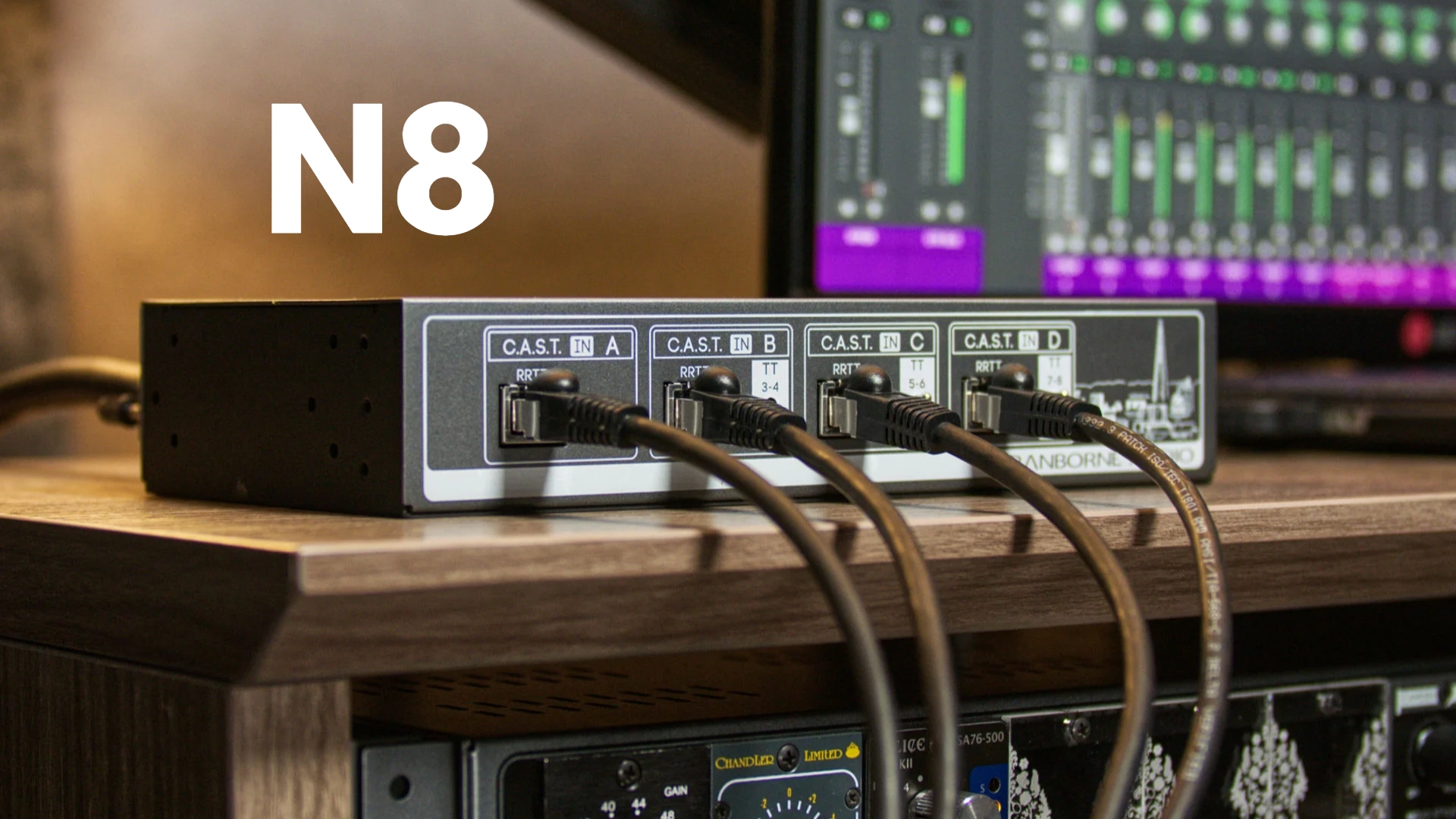 N8, Cranborne Audio’nun C.A.S.T sistemini kullanan ve network kablolarını (Cat5e, Cat6 veya Cat7) 4-kanal analog snake kablolara dönüştüren gelişmiş bir ses dağıtım merkezidir.