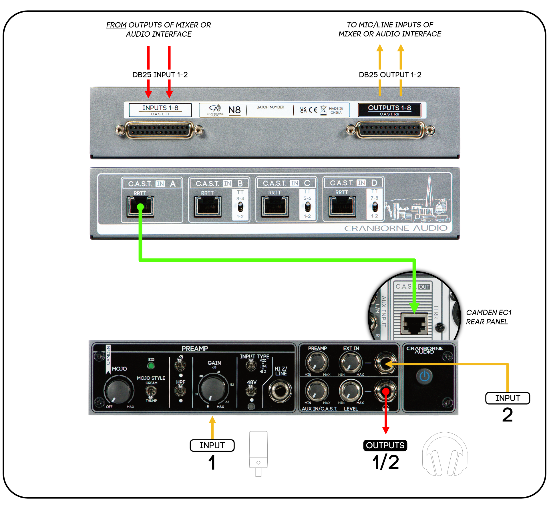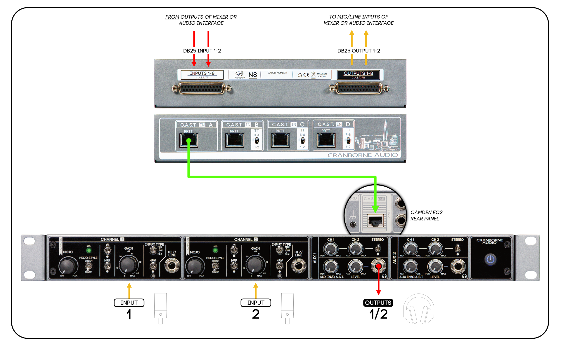 C.A.S.T. sistemi Cranborne Audio tarafından geliştirilmiş olan ve birçok cihazında kullanılan, tak-çalıştır basitliği ile sinyalleri dahiyane bir şekilde transfer etmenizi sağlayan bir sistemdir. Bu cihazların C.A.S.T. çıkışlarını N8’e bağladığınızda audio sinyalleriniz otomatik olarak ses kartınıza patch’lenmiş ve kullanıma hazır hale gelir. Camden EC2, Camden EC1 preamp ve kulaklık preampleri ile N22 ve N22H breakout box’ları C.A.S.T sistemini desteklemektedirler.