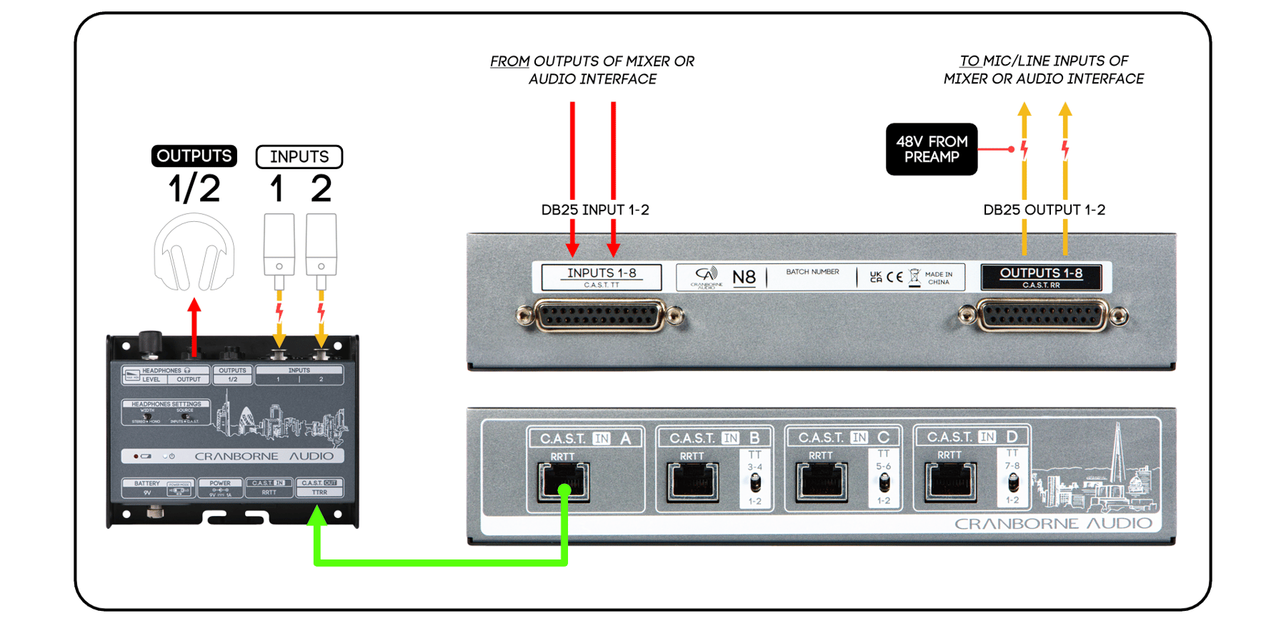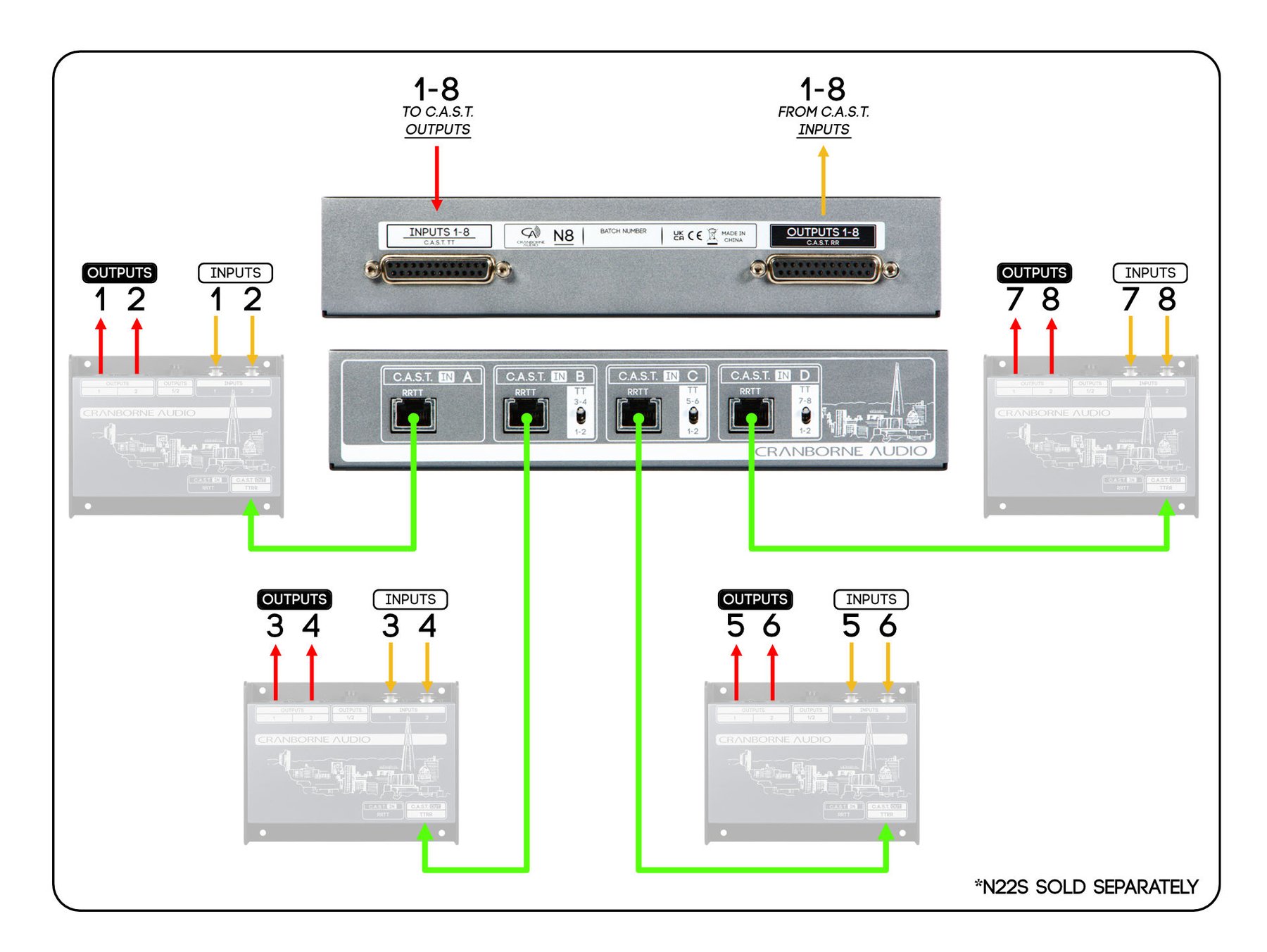 4 C.A.S.T. portuna sahip olan N8, 4 adet Cranborne Audio Breakout kutusunun aynı anda bağlanarak ses kartı, mikser veya herhangi başka bir ses kaynağı için 16 kanal ses iletimi ve dağıtımı sağlayabilir.
