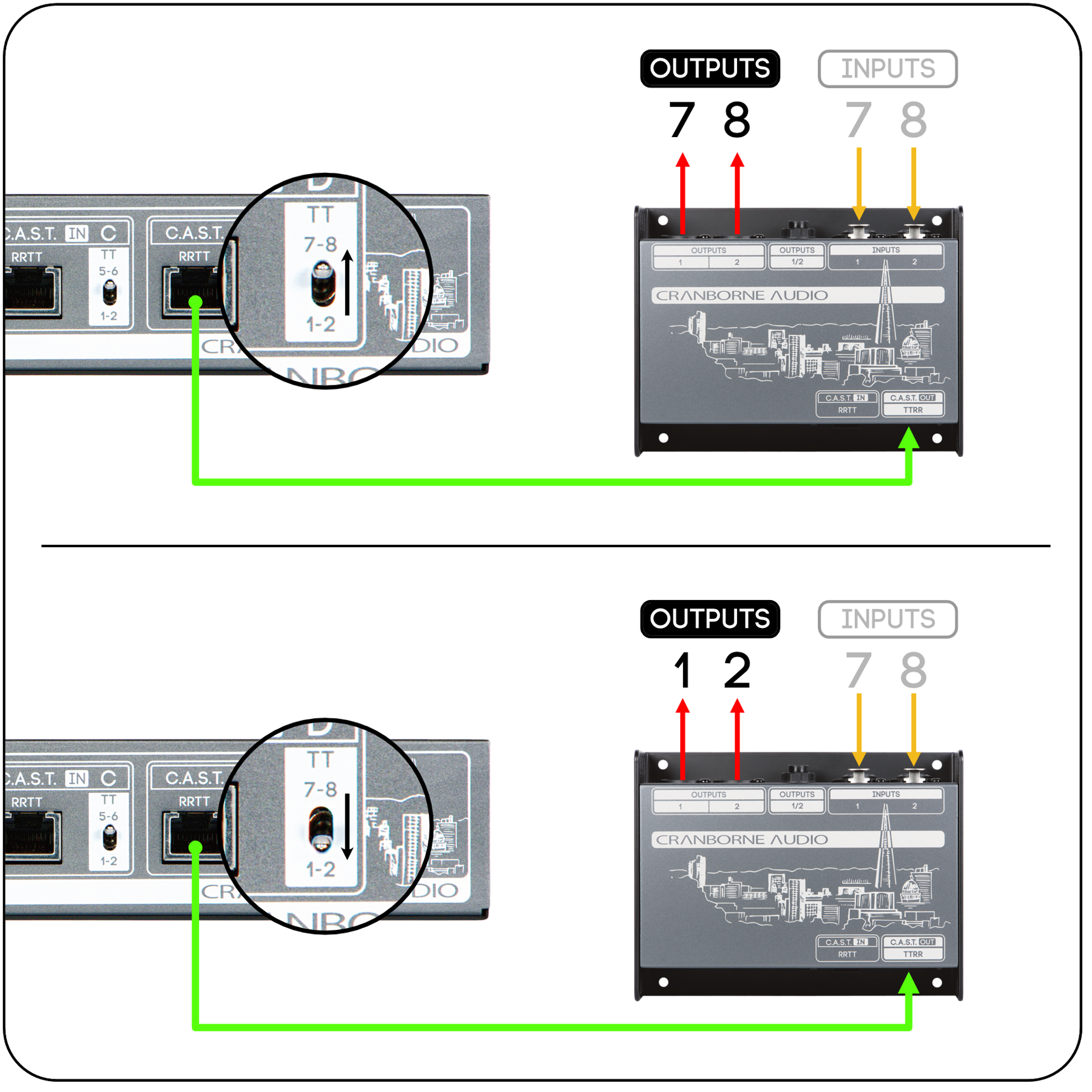 Ön panelde bulunan özel C.A.S.T. yönlendirme düğmeleri aracılığı ile N8’de bulunan her C.A.S.T. bağlantısı, bağlı olan tüm C.A.S.T. cihazlarına aynı stereo sinyali yollayabilir veya sanatçılar ayrı miks istiyorlarsa her birine ayrı stereo sinyal yollayabilir.